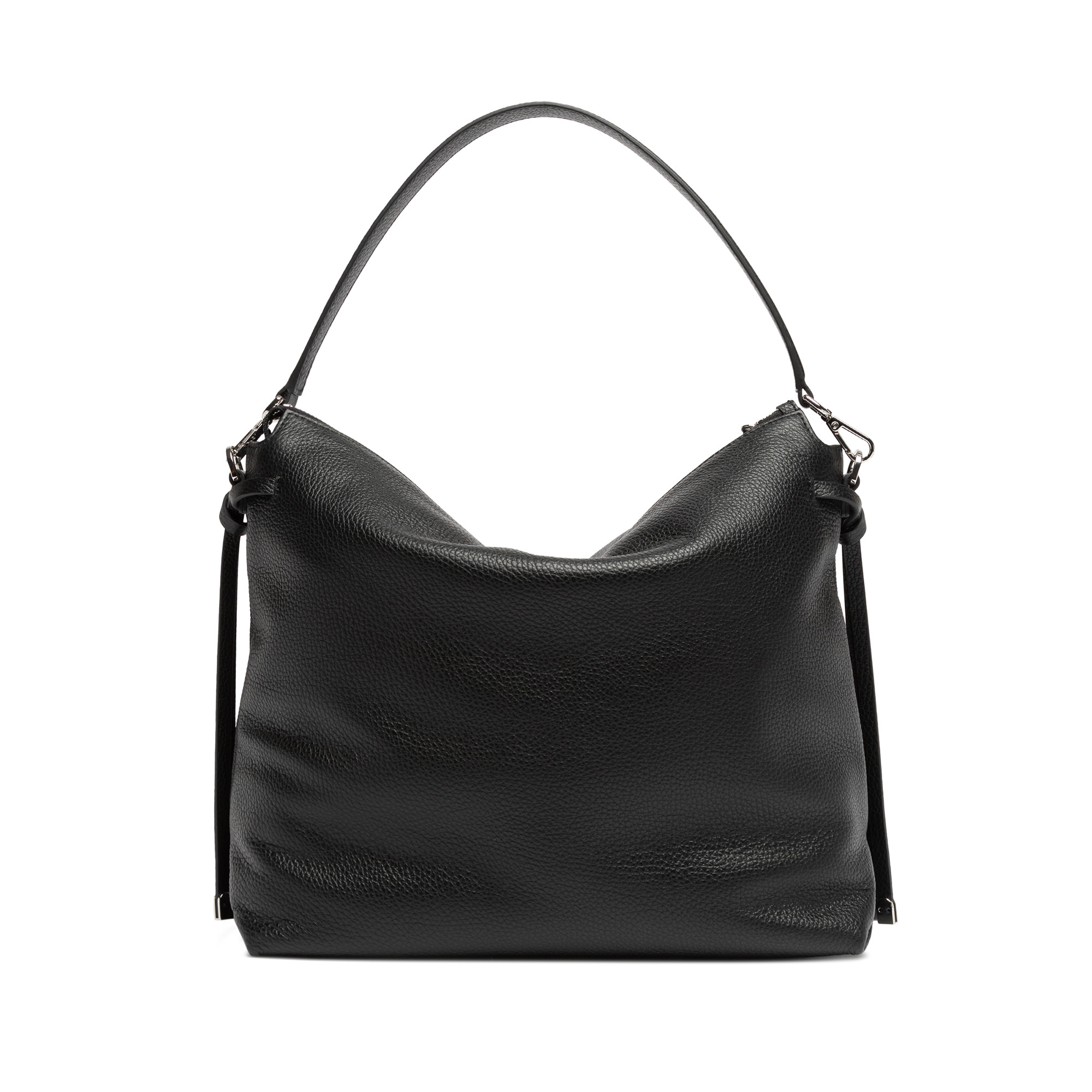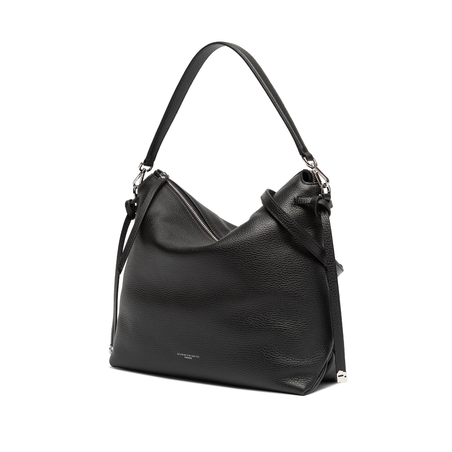 Brina by Gianni Chiarini Firenze è una borsa in pelle martellata con linee minimal e squadrate. I dettagli annodati e i componenti in metallo aggiungono un tocco luminoso. È dotata di un manico in pelle per essere indossata comodamente a spalla e di una tracolla regolabile e removibile, ideale per un’opzione crossbody. La chiusura superiore con zip garantisce sicurezza e praticità. Dimensioni: 32x28x11 cm.