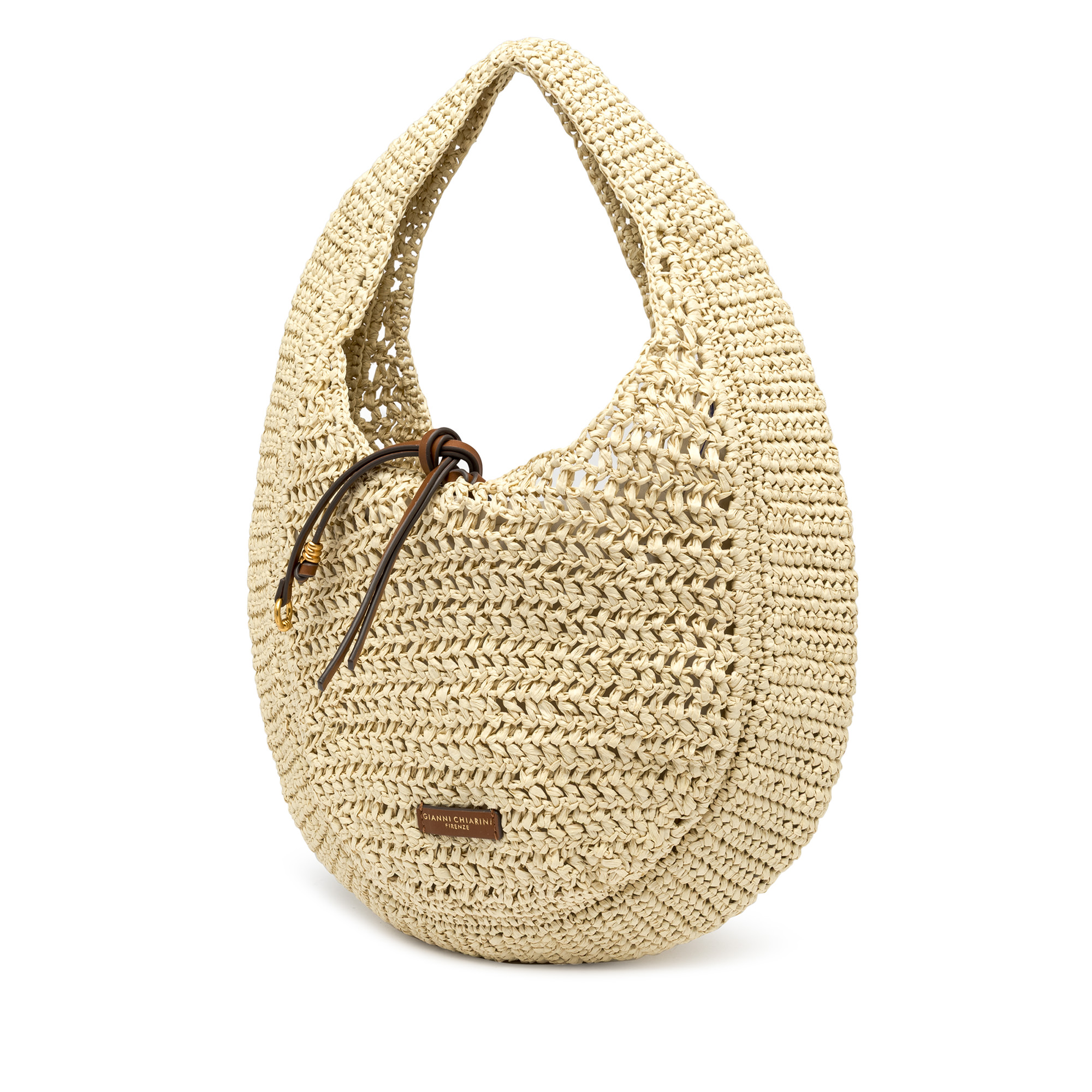 Nefeli è la nuova borsa hobo di Gianni Chiarini Firenze, realizzata in paglia crochet, perfetta per affrontare con leggerezza e stile le giornate estive. Presenta una chiusura con cordoncino e dettagli in metallo che donano un tocco luminoso al design. Dimensioni: 32x27x9 cm.