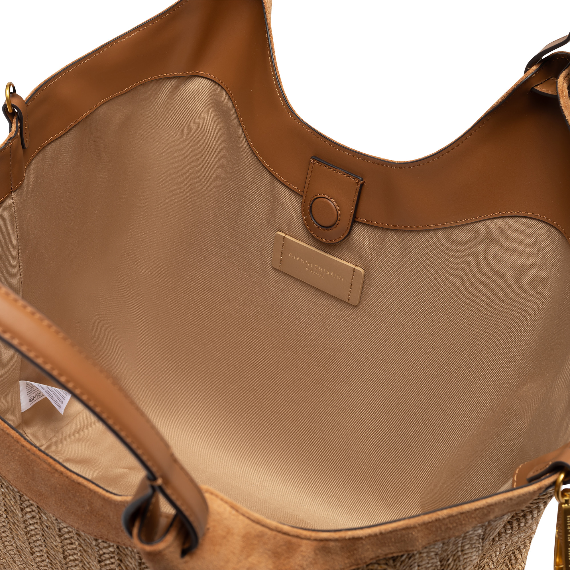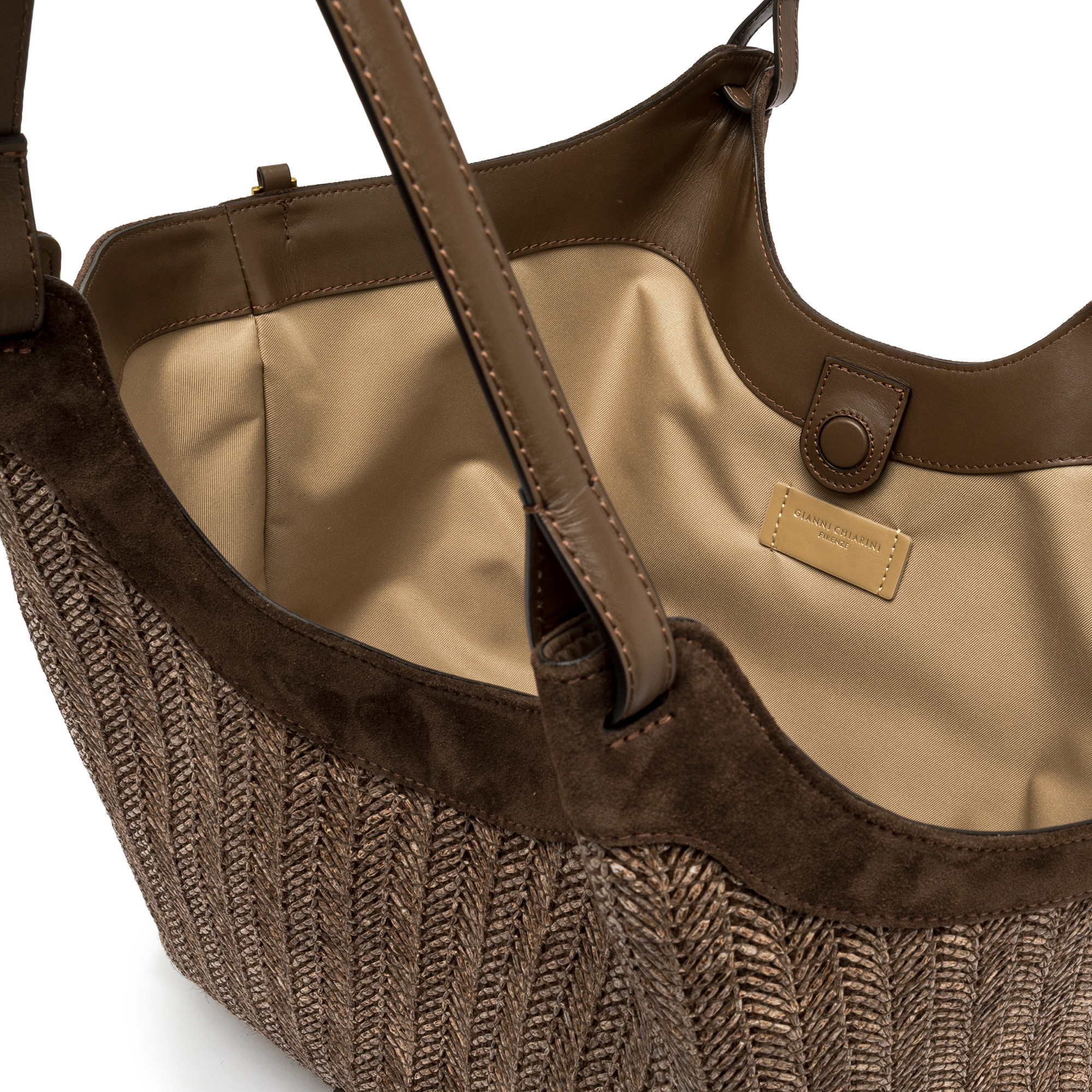DUA è l’icona del brand, una borsa dal design semplice ma contemporaneo, è l’accessorio perfetto per chi desidera un tocco squisitamente summer, senza rinunciare alla praticità. Realizzata in paglia intrecciata, evoca un fascino rustico chic. Dotata di un monoscomparto sfoderato e doppi manici in tono, si chiude con un bottone a pressione. Può essere portata a mano o a spalla. Dimensioni: 34x38x16 cm.