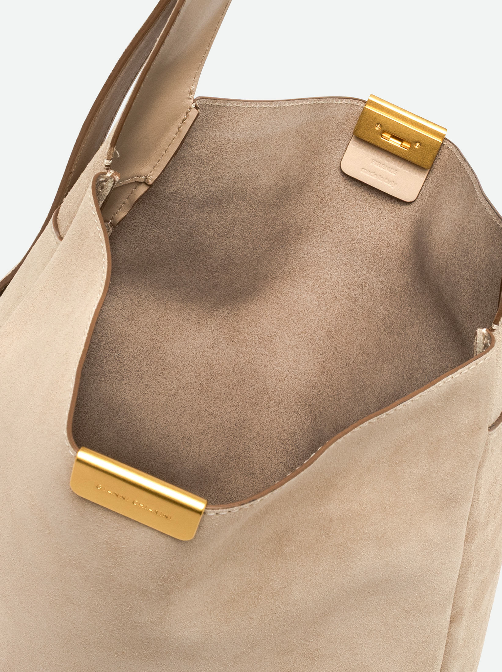 La shoulder bag Jo di Gianni Chiarini Firenze unisce semplicità ed eleganza in un design morbido e leggero. Realizzata in morbido suede, si distingue per la chiusura in metallo con metal plate logata che aggiunge un tocco di personalità. Dotata di due tasche porta borraccia assicurano massima praticità.