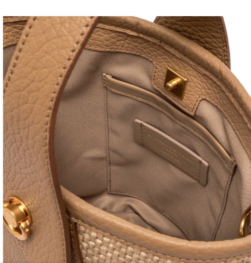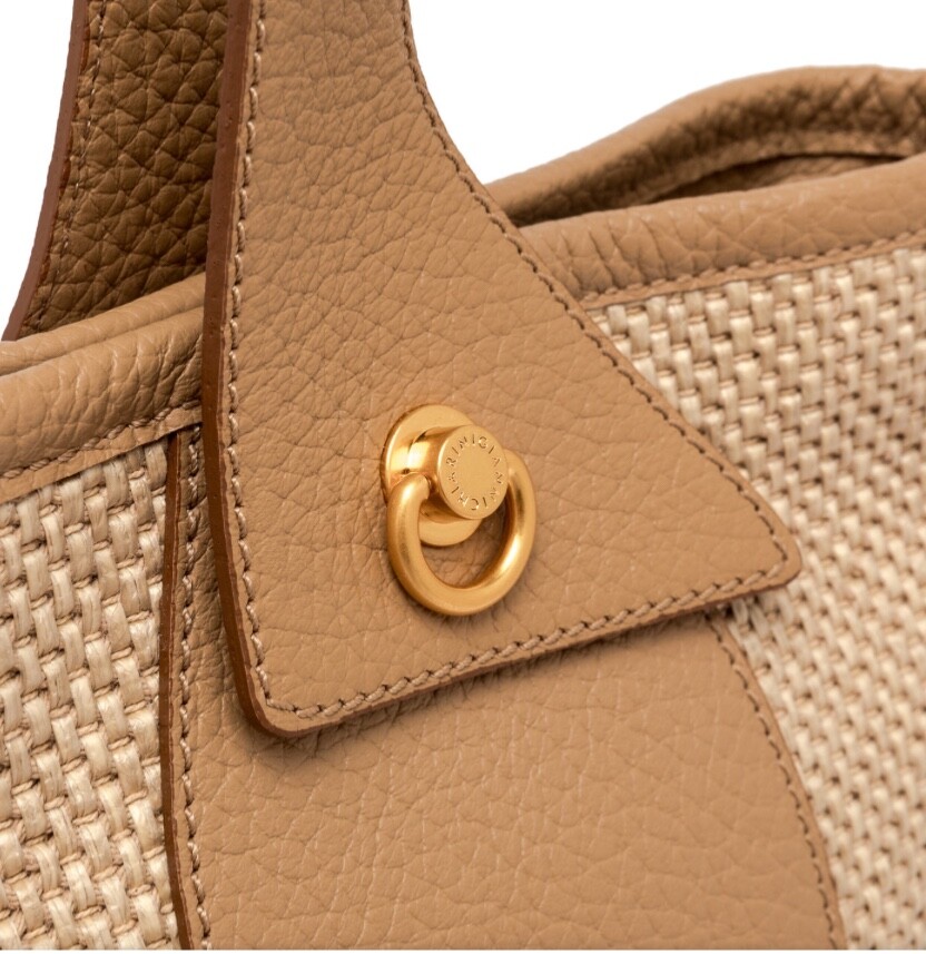 La nuova borsa by Gianni Chiarini Firenze Ester, con la sua shape a secchiello, è un classico intramontabile. Realizzata in tessuto di paglia intrecciata e impreziosita dal dettaglio dei due piercing con anellino decorativo è un accessorio estremamente versatile.
