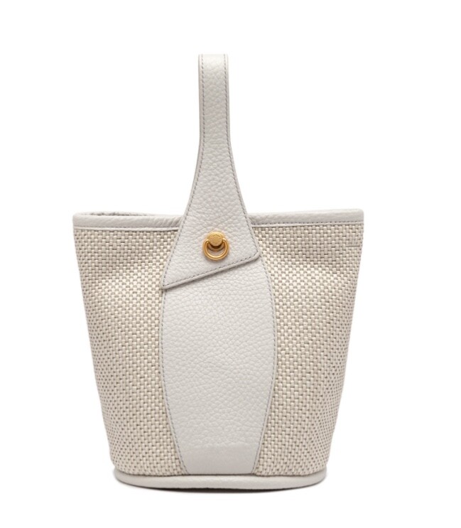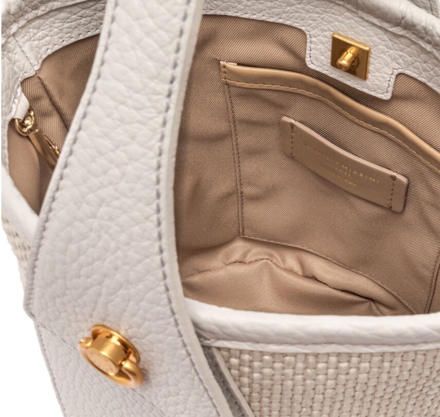 La nuova borsa by Gianni Chiarini Firenze Ester, con la sua shape a secchiello, è un classico intramontabile. Realizzata in tessuto di paglia intrecciata e impreziosita dal dettaglio dei due piercing con anellino decorativo è un accessorio estremamente versatile.
