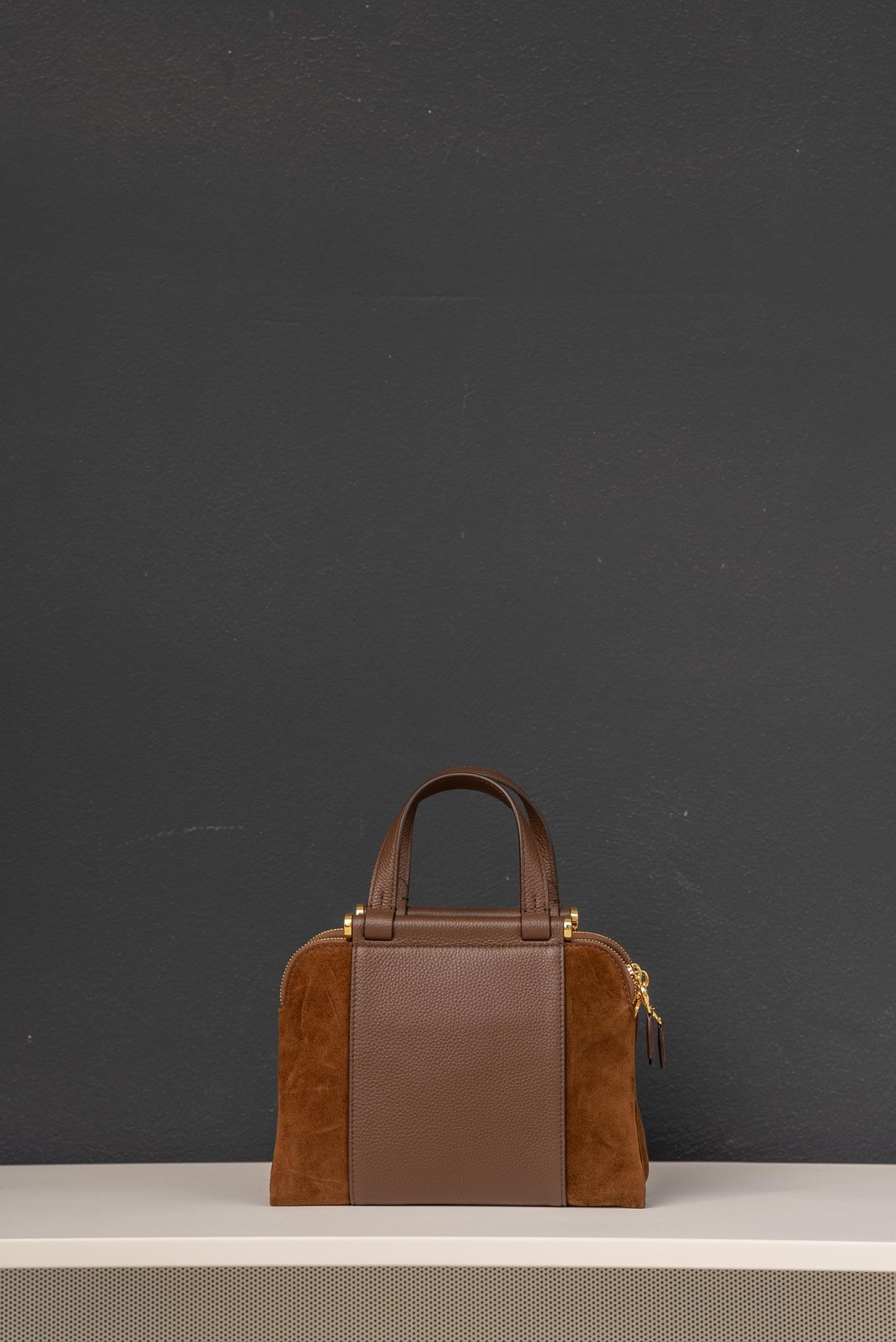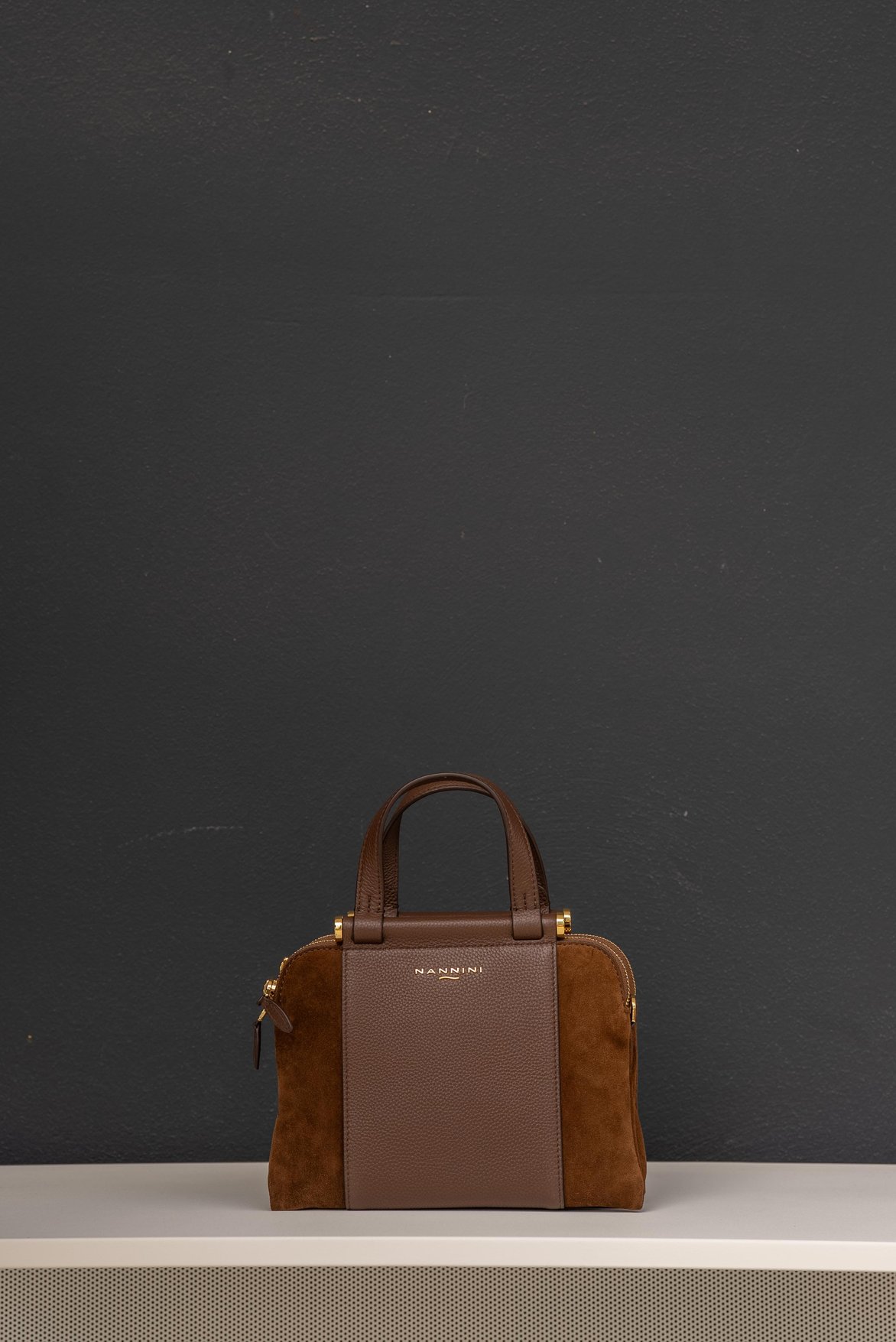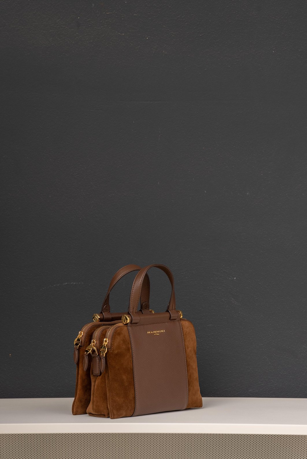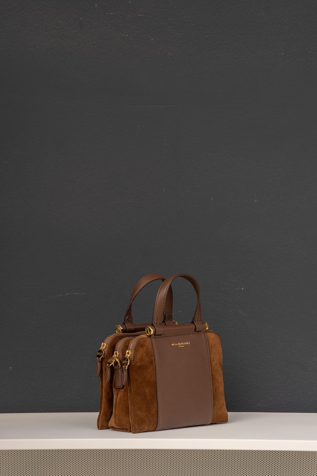 La Borsa a mano firmata Nannini Firenze, della Linea Febe realizzata in pelle con inserti in camoscio è caratterizzata da tracolla regolabile e removibile, mentre presenta 3 scomparti con chiusura a zip, è foderato internamente da tessuto logato di cui dispone di una tasca con zip.