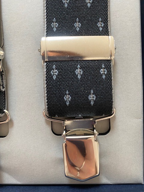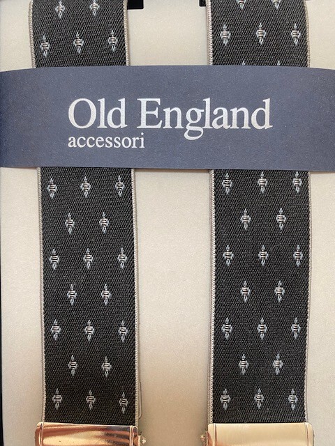 Bretelle elastiche con inserti in vera pelle. Brand: old enlgand. Lunghezza estendibile fino a 150 cm. Clip in acciaio.