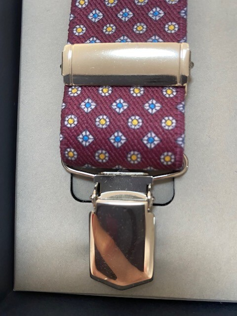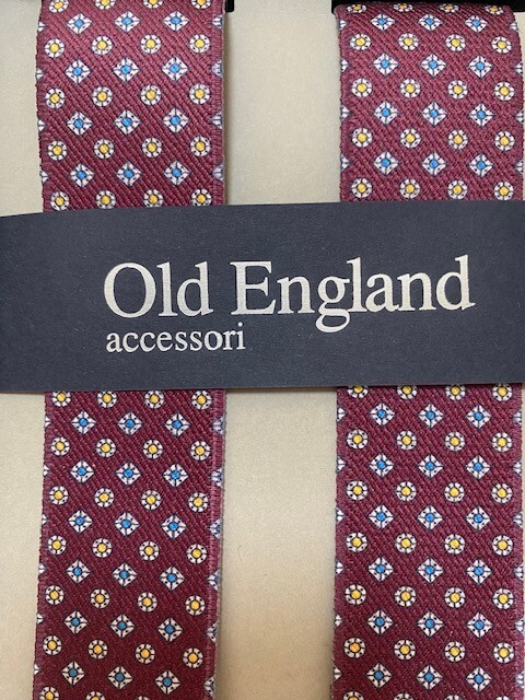 Bretelle elastiche con inserti in vera pelle. Brand: old enlgand. Lunghezza estendibile fino a 150 cm. Clip in acciaio.
