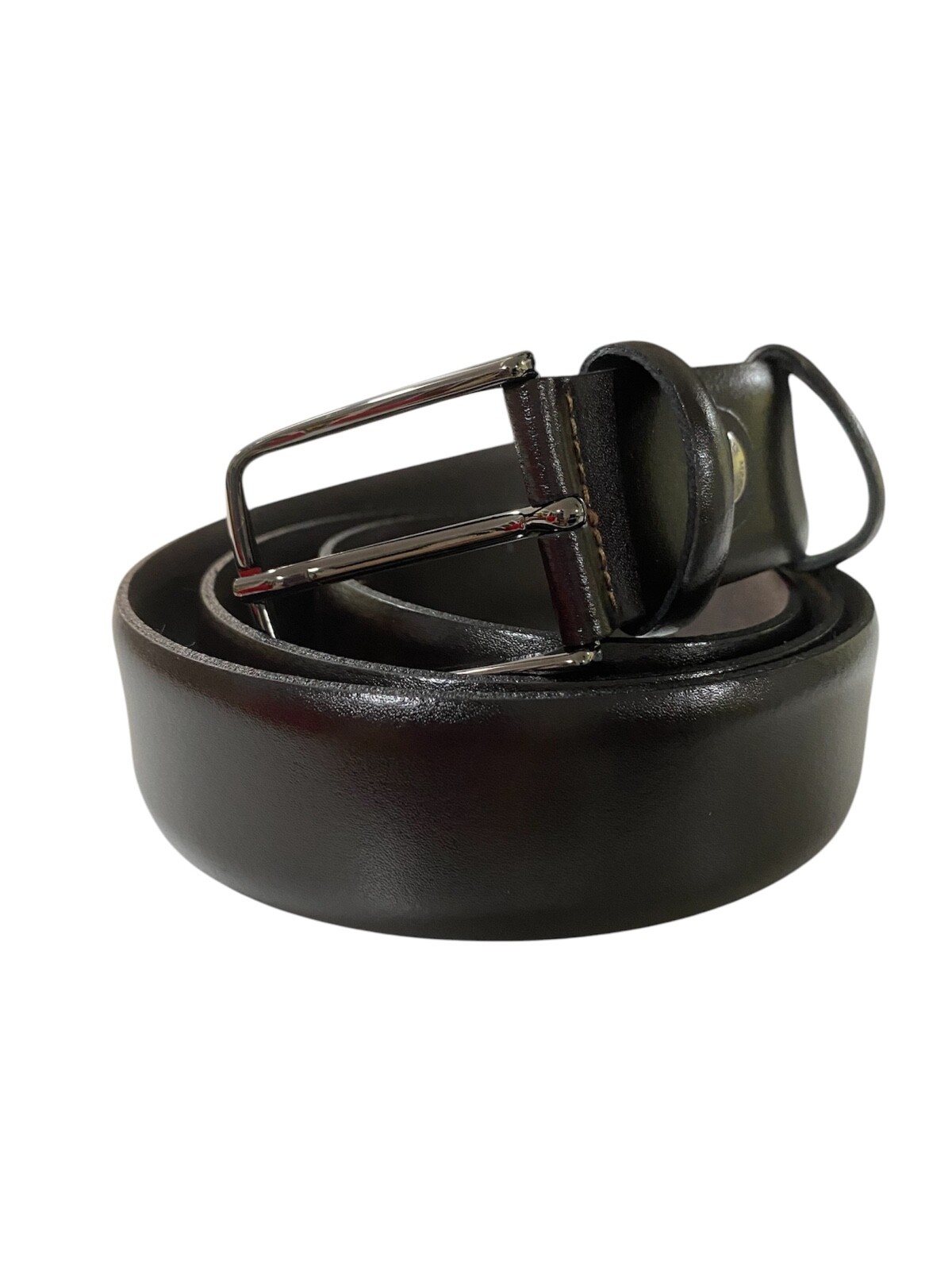 Cintura uomo in vitello spazzolato , marrone, senza cuciture leggermente lucida, ideale per cerimonie , doppio passante, chiusura con fibbia con ardiglione in acciaio cromato , altezza 3,5 cm lunghezza 110 cm. Lavorazione artigianale. Compresa di scatola.
