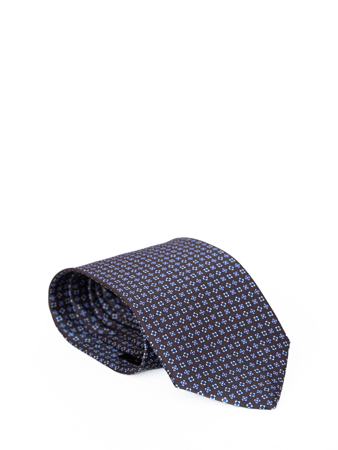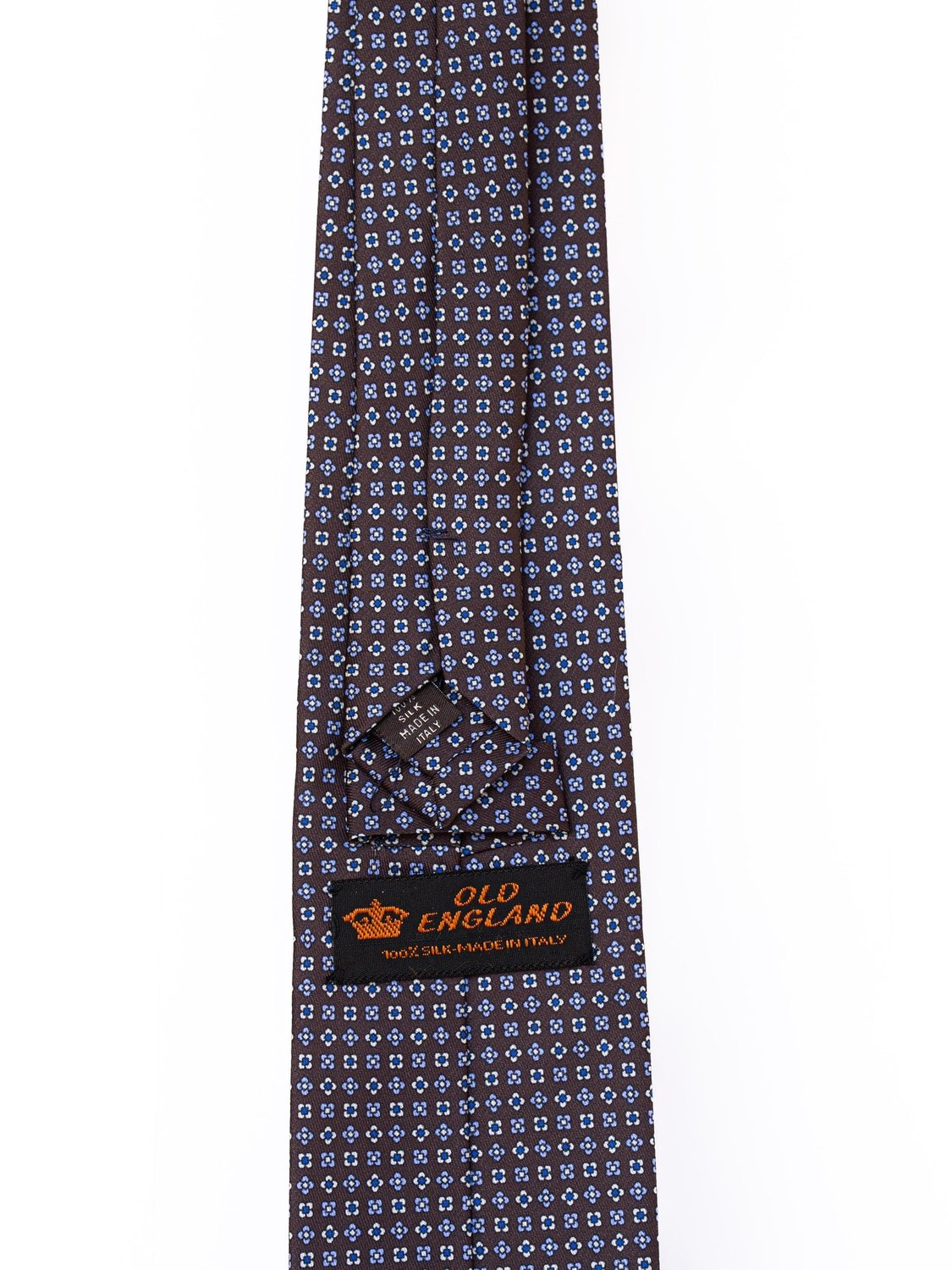 - Colori: Fondo marrone scuro con micro fantasia geometrica a quadretti nei toni del blu e del beige.
