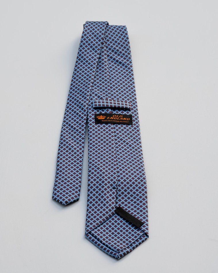 cravatta in pura seta caratterizzata da una microfantasia geometrica su un fondo prevalentemente azzurro.
