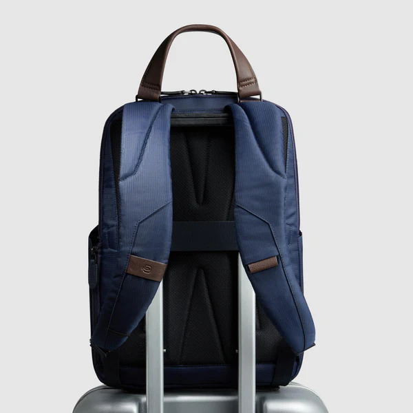 Zaino da viaggio in tessuto riciclato e pelle porta pc e iPad® con portaocchiali, tasche per AirPods® e ombrello, protezioni antiurto e RFID