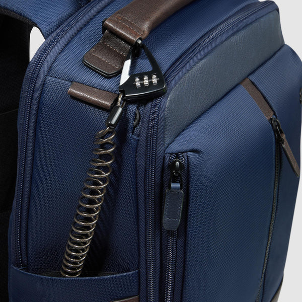 Zaino da viaggio in tessuto riciclato e pelle porta pc e iPad® con portaocchiali, tasche per AirPods® e ombrello, protezioni antiurto e anti RFID