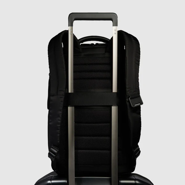 Zaino da viaggio porta pc e iPad® in pelle e tessuto con tasche per AirPods®, botttiglia e Piquadro Smart Tracker, protezioni antiurto e RFID